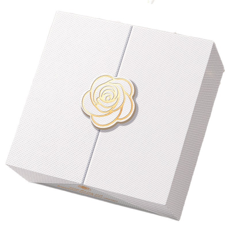Present luxury skincare in unparalleled elegance with our Gift Box Collection, featuring exquisite white packaging adorned with gold rose motifs and sophisticated inspired detailing. These premium boxes showcase a sleek magnetic closure system that opens to reveal plush white crinkle paper bedding, perfectly sized to accommodate SK-II skincare products and other luxury beauty items. The exterior features delicate gold foil stamping against pristine white background, while the interior provides secure cushioning that protects delicate bottles during transport. Each box includes coordinated ribbon accents with messaging, creating a complete luxury unboxing experience from first touch to final reveal.